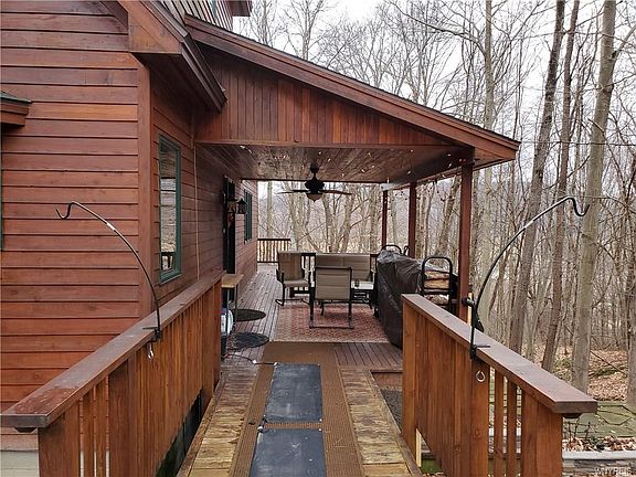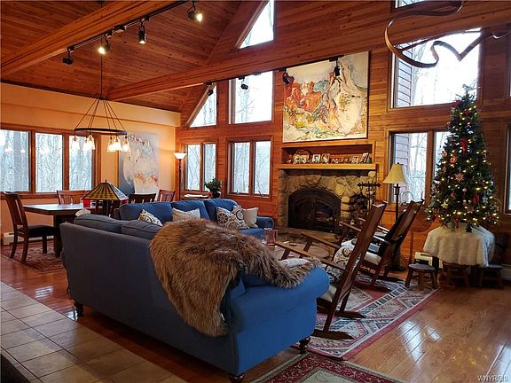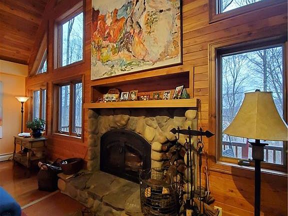 Touched by Nature! This chalet has it all - location, style and comfort. Wood-burning stone fireplace is focus of the Great Room. Kitchen with granite counters and high-top seating area. First floor bedroom and full bath. Upstairs is the master suite with private balcony. Master bath has heated floor/towel racks, 2 sinks and fantastic walk-in shower that gives you a view of the forest. Lower level has huge family room with wood burning stove, full bath and bedroom. The outside is made for living, too! Two covered decks with ceiling fans, one overlooking a brook that runs most every season. A third back deck with hot tub to relax in under the tree tops and stars. At the end of a private road and abutting McCarty Hill State Forest with 3,278 acres is yours to enjoy anytime.