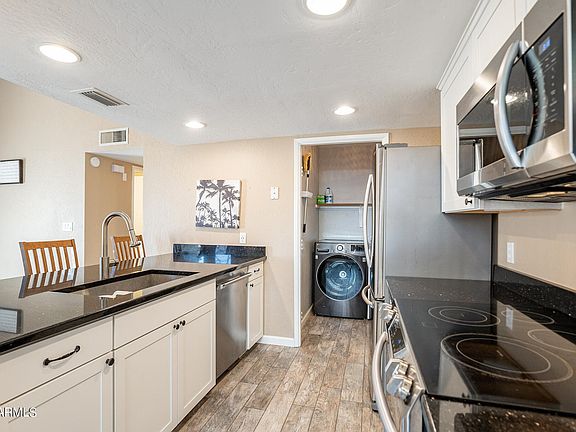 Beautiful & Unique townhome in the heart of Chandler! Wonderful 2 bedroom home with an open concept living room and kitchen with breakfast nook. Gorgeous Vinyl plank floor give a classic wood look. Upgraded kitchen with White Shaker cabinets, stainless steel appliances and granite countertops. Nicely renovated bathrooms with travertine tile, all new windows throughout. Smart home features, including smart lock, video door bell, and smart thermostat. Laundry with washer and dryer, Outdoor fenced patio area, 2 parking spots (one covered). Community pool!