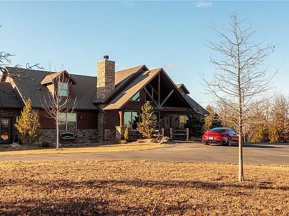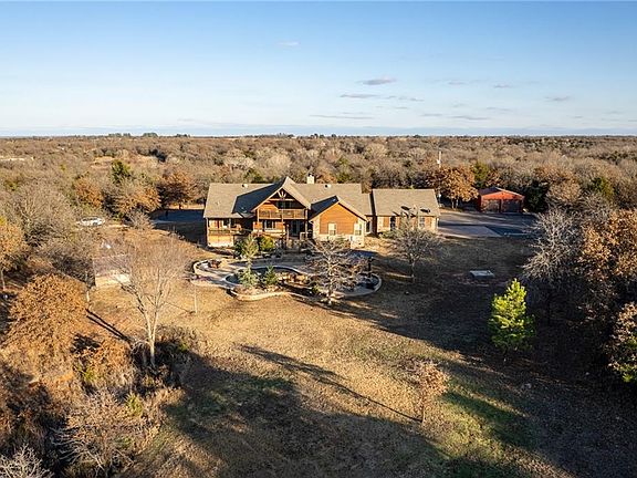 Colorado in Oklahoma does exist! In fact perched atop a rolling hill is a beautiful modern cabin, and additional tiny home minutes from the turnpike. As you pass the gated entry, and through the winding driveway you will be enchanted when the trees open up to show this idyllic home! This 13.9 acre property has it all! From gorgeous views, to a beautifully landscaped pool with a waterfall, to a 30x50 shop with RV parking and hookup, a stand alone apartment build in 2021 that is 528 sq ft, as well as a detached 2 car garage in addition to the 2 car attached garage! The home has been meticulously built featuring a cathedral ceiling, soaring windows, and an open kitchen with new appliances, new sueded quartzite countertops and a beautiful new textured backsplash. For the outdoorsman, trails can be found throughout the acreage! No dirt roads here...getting to the property is paved all the way! Only 20 minutes away from downtown Okc.