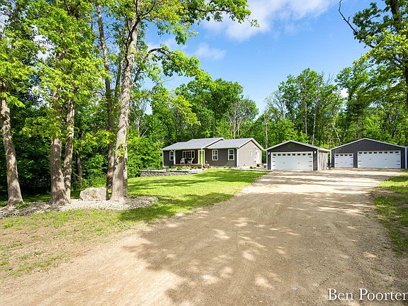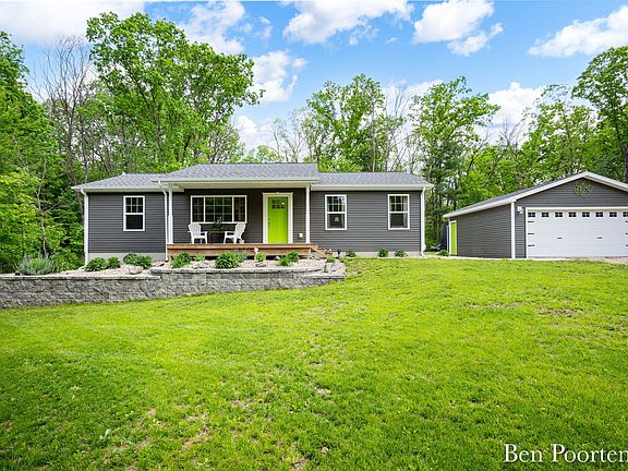 Welcome to 20192 Gates Road, conveniently located just minutes from US131 in Howard City. This custom built home sitting on 3 acres was built in 2022 and features both an oversized 24x20 garage AND a 30x40 pole barn! Outside you can spend time relaxing on the front porch or rear deck overlooking your private backyard. Inside you're greeted with vaulted ceilings and natural light in the living area. The kitchen has stainless appliances, hickory cabinets, countertop eating area, pantry and dining area with walkout to the rear deck. The main level master bed features a large closet, and attached ensuite boasts dual vanities and 2-person tub to relax after a long day. Adjacent to the living room is the 2nd bedroom and full bathroom with main floor laundry. Neatly hidden behind a clever murphy door is a bonus room that could be used as an office or 3rd bedroom Downstairs in the daylight basement with 9 ft ceilings you'll find a 4th bedroom, huge living room and additional finished bonus space. Pole barn is wired with 100amp service and has both a 16x9 and 9x8 overhead door. Whether you are looking for more storage for your outdoor toys, a workshop, home gym or additional hangout space this one checks all the boxes!