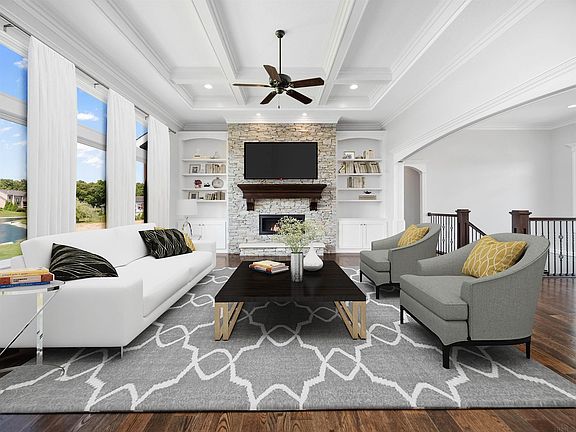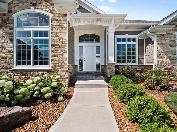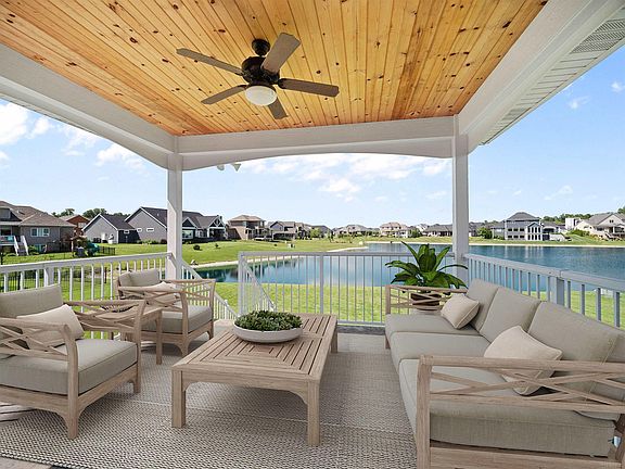 Spacious split-bedroom ranch and Art Schmucker built with ATTENTION to DETAIL inside and out! As you make your way to the covered front porch you'll notice an extensive use of stone on the exterior, a stamped porch, arched windows with muntins, corbels, dental molding, and accent shake shingles! The large and bright foyer opens into the stunning great room, the elegant formal dining room, and an open stairway to the finished DAYLIGHT basement. Extensive TRIM is evident throughout with ornate, detailed crown molding (in almost every room) and wainscoting. The dramatic great room is highlighted with a coffered ceiling, a stone fireplace with an impressive custom mantel, built-in bookcases, hardwood flooring and a wall of windows to enjoy the WATER view. The open kitchen will delight any chef and features an array of custom touches that include: GRANITE countertops, large island complete with farmer's sink, marble backsplash, dove-tail cabinets, under cabinet lighting, walk-in pantry, Frigidaire Gallery series stove(gas cooktop), dishwasher and microwave, and on-trend elongated tile flooring. The nook includes a soaring angled ceiling and sliding doors that lead to a covered stamped deck. The formal dining room features hardwood flooring, wainscoting, extensive trim around the windows and doorways, and tray ceiling with crown molding. A mud room provides great organization with custom cubbies and a closet. The main bedroom includes a tray ceiling with lighting, a sitting area with views of the WATER! The main bathroom includes separate vanities with GRANITE, a custom TILED SHOWER with rain head, tile flooring, separate tub, and a 15x10 closet! Bedrooms 2 and 3 include a Jack n' Jill bathroom with tile flooring and a soaring ceiling with window to keep things bright. The open stairway with metal spindles leads you to a FINISHED daylight basement complete with a WET BAR (with GRANITE) and 9' celings. Also included in the basement is large rec. room, the 4th bedroom, a full bath, 2 additional finished areas, and a mechanical room that offers plenty of space for storage. The laundry room doesn't disappoint with cabinets, a laundry sink, a drying rack, tile flooring, a closet and 2 windows (with custom trim)! Additional features include: Andersen Windows, 2 water heaters, an IRRIGATION system (with drip beds in the flower beds), utility sink in the garage, and covered DECK.