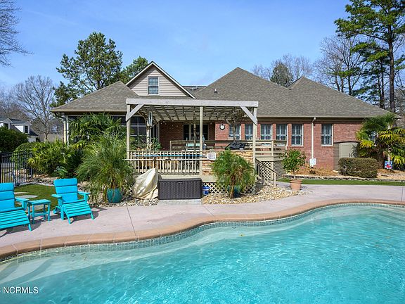 Tucked back in the desirable Taberna community is this beautiful brick home, perfectly situated on over an acre with a heated saltwater pool and well-maintained, mature landscaping. Welcome guests through the glass front door to the foyer where they will be wowed by the abundant natural light and apparent elegance from the foyer, through the living room, into the formal dining room. Gather with guests under a tall vaulted ceiling in the living room by the cozy gas log fireplace. Host dinner parties in the formal dining room. Thermador and Viking appliances are ready to assist in the making of delicious meals from the kitchen offering granite countertops, a pot filler, an inlay refrigerator and solar tubes for added natural light. Off the kitchen you have a den with cathedral ceiling, perfect for relaxing with a favorite book. Find a private home office space next to a first floor guest bedroom. The master bedroom is spacious and finished with a large walk-in closet and en suite bathroom offering a dual sink vanity and walk-in shower. Head upstairs through the large laundry/mudroom to find the third bedroom. The true highlight of this magnificent home is the outdoor living space! Spend any time of year on the screened-in porch equipped with EZ Breeze windows. Host cookouts with the help of the outdoor kitchen under a pergola. Hang out on the back deck with a built-in bench seat or take a dip in the in-ground swimming pool. The patio is surrounded by Atlantic Turf in the fenced-in backyard for the easiest maintenance possible. More notable features include a Kinetico Water System, a 2017 roof, a tankless water heater, and an award winning school district. This nature backed property is located just minutes from Historic Downtown New Bern and a quick drive to MCAS Cherry Point or North Carolina's Crystal Coast beaches. Reach out to us today for your private tour before this beauty is gone!