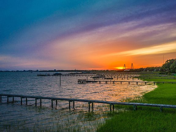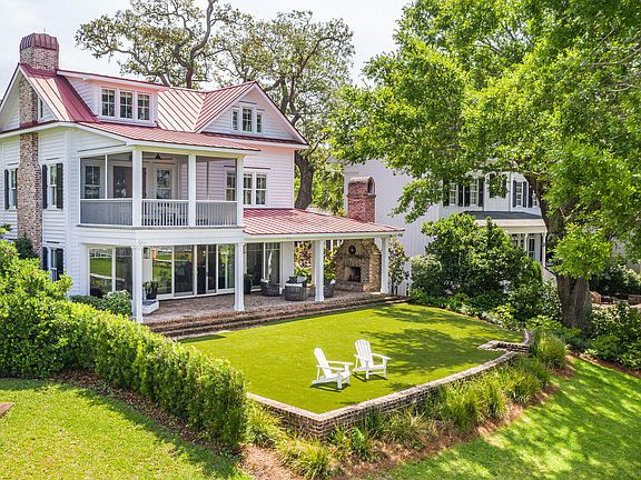 Old Village deepwater harbor front home with private dock nestled on a high bluff overlooking the Charleston Harbor, downtown Charleston, Ravenel Bridge and Fort Sumter. Stunning home built by Daly and Sawyer in 2008 and completely renovated in 2018 for a more modern and timeless aesthetic. This 6 BR, 6.5 BA with over 6500 sq ft home is elegantly designed for luxurious living. The first floor boasts an open floor plan that includes a true chef's kitchen as well as a catering kitchen for greater ease when entertaining. The kitchen is embellished with state of the art stainless appliances, multiple refrigerators, multiple sinks, custom cabinetry, large center island and beautiful natural stone countertops. The kitchen opens to the family room enhanced with a handsome fireplace that flows seamlessly to the outside brick terrace overlooking the stunning waterfront vistas. Another masonry fireplace and outdoor kitchen further embellish the outdoor living experience. Additionally on the first floor is a guest room en suite, powder room, custom service bar and elevator to access all three floors. On the second floor enjoy the master bedroom ensuite with magnificent harbor views complete with fireplace and private screened in porch with water vistas and views of the Charleston skyline, Fort Sumter and Sullivans Island! The master bath is beautifully finished with custom cabinetry, custom stonework, soaking tub, glass shower, water closet and large walk in closet. Just outside the bedroom is a private space well suited as a small office. Three additional bedrooms en suites are located on the second floor with nicely sized walk in closets. The laundry room has space for two sets of washer and dryers as well as plenty of storage, deep sink and large surface area for laundry services. On the third floor is a fabulous media room, game room, large bedroom, multiple closets and full bath. Architectural features throughout the home include gorgeous tall ceilings, ship lap detail in just the right spaces, custom cabinetry, beautiful french oak flooring, and natural stone finishes in all of the bathrooms and kitchen. Plenty of parking is available with the new two car garage and an adjoining large parking pad. There is a gorgeous masonry outdoor fireplace as well as an outdoor grill area under cover of the wrap around porch. This home lives remarkably well and is ideally located to all that the Old Village lifestyle affords. Walk, bike or golf cart to nearby restaurants, shops, parks, and schools. Charleston and the beaches are all within ten minutes of driving. There is not a more idyllic and charming residence to call home.