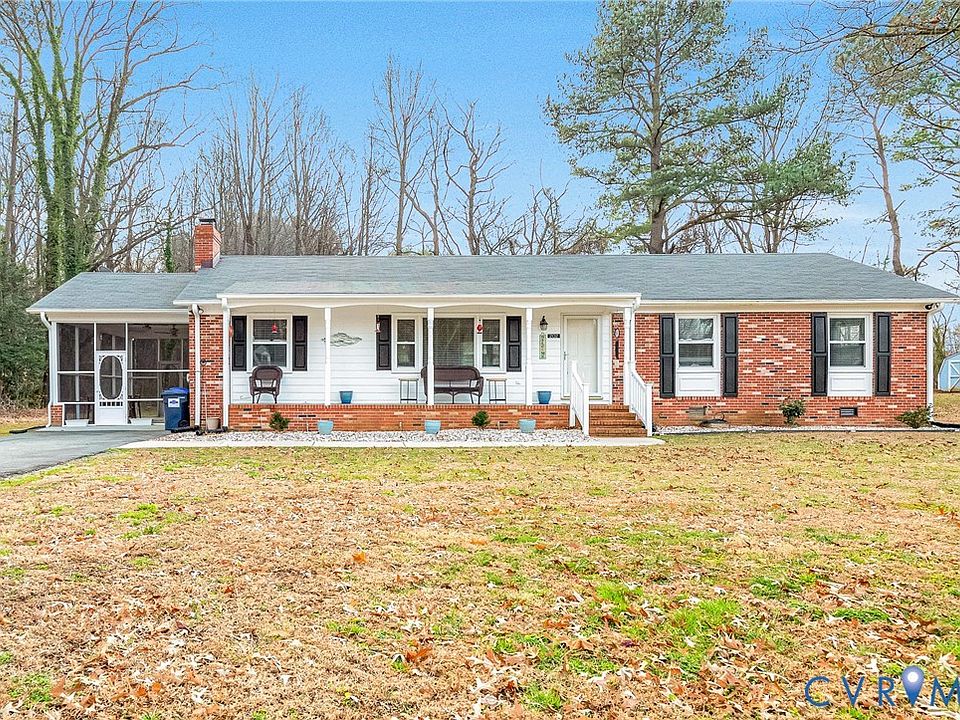 Renovated open-floor-plan brick ranch in the Gwynnfield Subdivision, a Rappahannock River water-access neighborhood and golf cart community. This home features a spacious, open layout ideal for entertaining. The kitchen offers newer white cabinetry, granite countertops, stainless steel appliances, and a massive center island—perfect for gatherings. The kitchen flows seamlessly into the open family room, dining room, and foyer, all showcasing hand-scraped Acacia wood floors, oversized baseboard trim, and crown molding. The primary bedroom includes a private ensuite bathroom with a stand-up tiled shower. Two additional bedrooms share a hall bath with a tub/shower combination. Major recent updates include all new exterior doors and front storm door, encapsulated crawl space, new shed, Leaf filter gutter system, lock tight screen on screen porch, gas logs, Rinnai Tankless water heater. Enjoy the relaxed river lifestyle with access to community beaches, a pier, and a boat ramp. Unwind on the attached screened porch—perfect for entertaining or picking crabs after a day on the water.