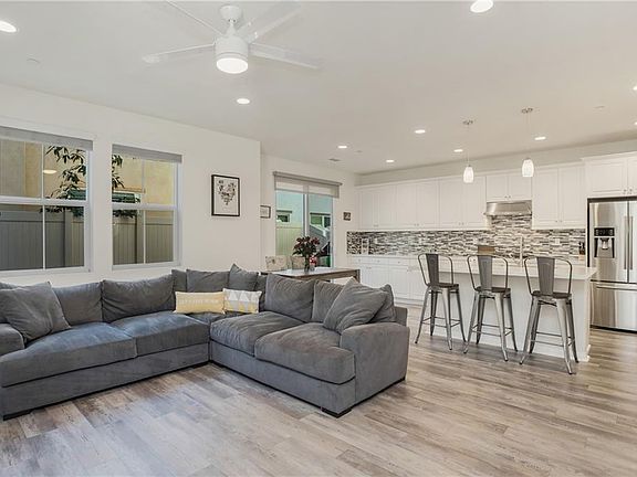 Immaculate condition and attention to detail describes this home. Soaring ceilings, light-catching windows, recessed lighting, and luxury vinyl plank flooring compliment the bright and open floor plan. Enter into the spacious living room with modern color tones. The designer kitchen is well appointed with a large center island, stainless steel appliances, white shaker cabinets, quartz countertops and breakfast nook which opens to the patio. Convenient main floor half bath and storage area with additional cabinet space. Upstairs, you will find a luxurious master suite with plush carpet and his/hers walk-in closet. The master ensuite is spa-like with double sinks, sunken tub, and a walk-in shower. Down the hallway, there are two additional spacious rooms with plush carpet and light-catching windows and walk-in closets. Adjacent to the bedrooms there is a bathroom with double sinks, white modern color tones, and beautiful tile flooring. Convenient second-floor laundry area with additional cabinets and storage space plus a tech center area round out the second floor. Third story fourth bedroom with a full bathroom complete this modern and luxurious home. Private end of the street location with a premium lot. One of a few homes in a community with a private driveway. Low maintenance backyard! Energy efficient home with foam insulation owner pays HOA dues