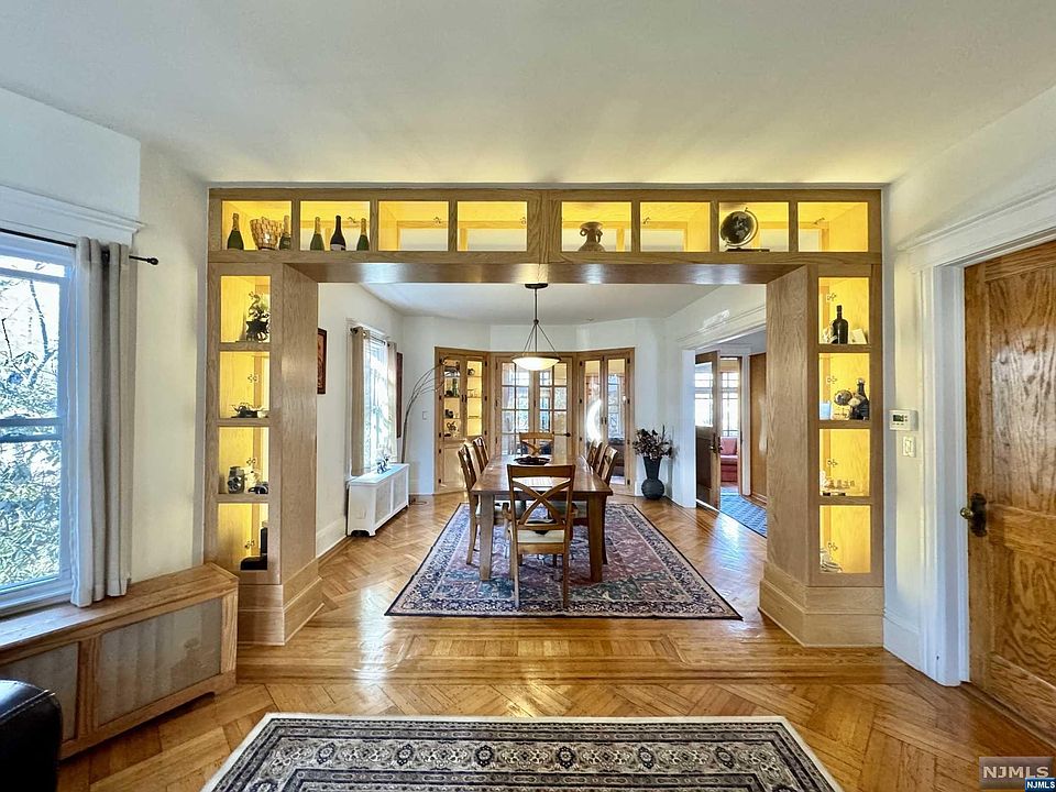 Discover the epitome of Leonia charm in this exquisite colonial home, nestled on a sprawling 12000 sqft lot. With 4 bedrooms, 4.5 baths, and a versatile den (currently a laundry room), this residence seamlessly combines spaciousness with functionality. Step inside to be greeted by double doors leading to a gracious porch and a stunning oak staircase with herringbone flooring. The living room and formal dining room exude sophistication with high-quality woodwork and lofty ceilings. The kitchen features Brazilian wood floors, granite countertops, Viking appliances, and 2 skylights for natural light. A sliding glass door connects to the deck overlooking the park-like backyard. The primary bedroom on the 3rd floor offers large walk-in closets, a full bathroom with ductless AC, and a skylight with a remote control shade. Complete with a 2-car garage and close proximity to schools, shopping, transportation, and parks, this home offers unparalleled convenience and limitless potential.