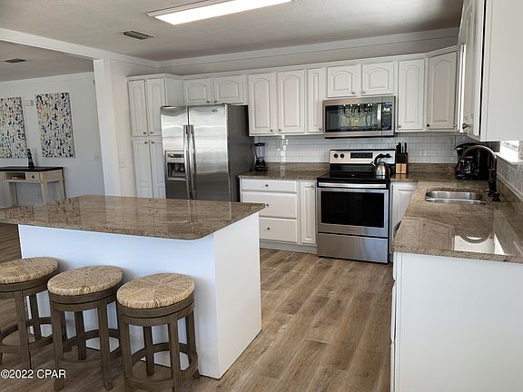 Very nicely remodeled, move in ready, 4-bedroom 2 bath home that sleeps 8 with lots of improvements. It boasts an open floor plan and very spacious kitchen with an island and an extendable dining table that seats up to 10. New and highly coveted heated and cooled salt water private pool in large private fenced back yard that is perfect for you and your family to spread out and enjoy a luxurious swim, lounge in the sun, relax in the covered patio and enjoy your meal al fresco. Great location on the popular slow paced, quiet West End of Panama City Beach with no high rises. Take a walk just two blocks to the beach with renown sugar sand and crystal clear emerald water. Sunnyside Grill only 4 blocks, or drive 3.2 miles to Pier Park, 5 minutes to grocery stores/dining, and 30 min from airport.
