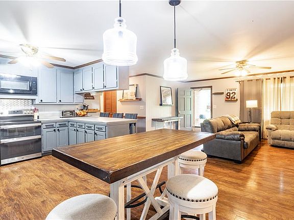 Seller has a VA loan that is assumable (approximately $162,350 on loan at 2.75%). Lovely full brick ranch with a super open floor plan and 1.3 AC in Rockwell! Spacious, level yard is very beautifully landscaped with raised beds for gardening. Part of backyard is fenced. Home sits far from the street with inviting rocking chair front porch. Roof replaced in 2021, kitchen appliances new in 2022, LVP flooring. Wood burning fireplace in living room. Many newer fixtures. Renovated bathrooms! Huge deck on rear of home. Detached carport included as well as 2 storage buildings.Previous garage footage has been finished with new carpet, new paint a new heating and A/C unit installed. So many potential uses for this space!