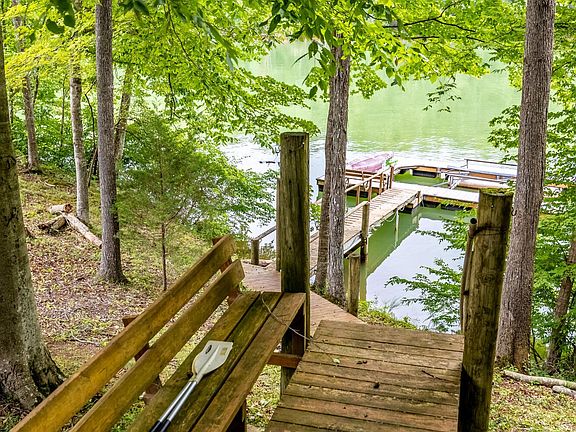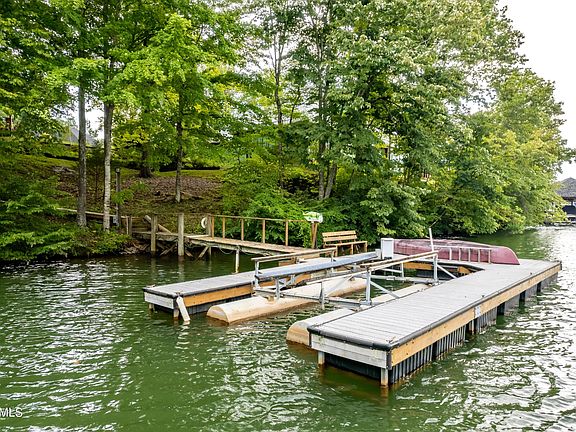 Here's the year-round water that you've been looking to own for years. The custom lake house is just a bonus. This home sits back in a quiet cove with 30' deep year-round water. Home features include lots of privacy, a private floating dock with lift, a huge covered back porch overlooking the lake, 2 owners suites on the main level, a beautiful wood-burning fireplace, stunning beams in the living area, 2 washer and dryer hookups (1 on the main level and 1 in basement), HUGE workshop in the basement, extra bathroom and possible 3rd bedroom or office in the basement. The neighborhood includes clubhouse and pavilion for parties and monthly get-togethers, a pool, two tennis/pickleball courts, and more than 60 slips for boats and personal watercraft.