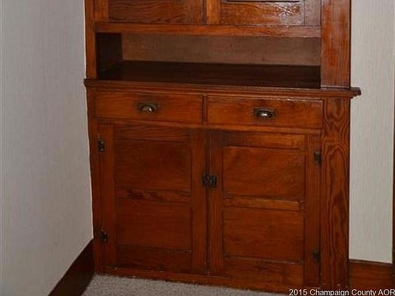 Probably nearly 100 years old - no one, even the tax records can confirm the age; this home sits on a slight hill near the center of town, but has an exceptional "L" shaped lot at the back to make a lovely, spacious yard lined with evergreen trees. The full unfinished basement stays dry in all but the worst of rainstorms and has a sump pump for those times. 3 extra rooms in the basement for storage, hobbies, etc. Washer & dryer are there. All rooms except the kitchen are carpeted, but are original wood underneath. All woodwork is original - never painted. Furnace & A/C new in '08; hot water heater new in '06. New windows in back and treated wood front porch. Gutter helmet all around. 2-car, oversized heated detached garage has electricity, new door openers and vinyl siding.