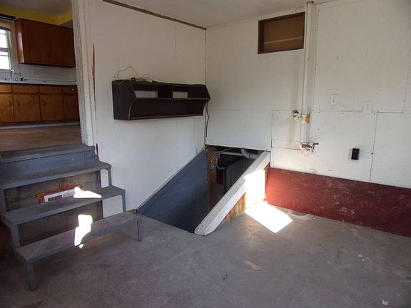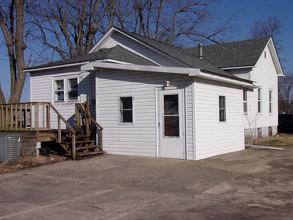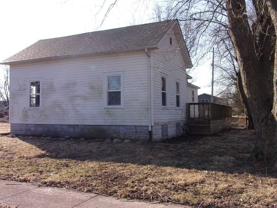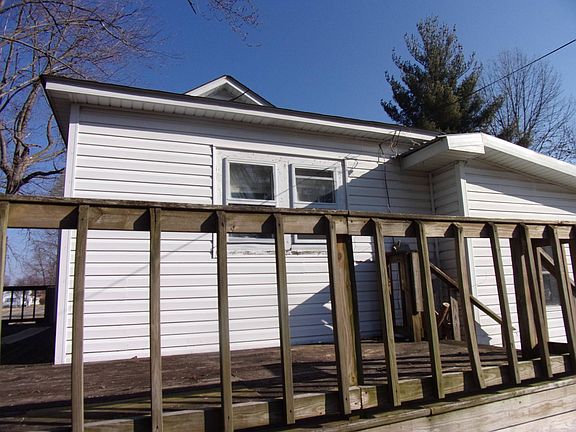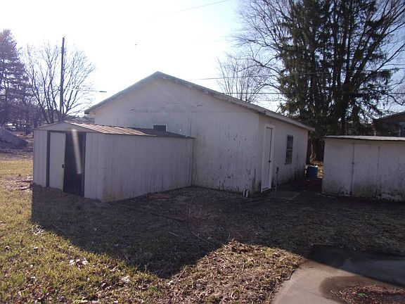 This property is located on a corner lot and is improved with home detached 2 car garage, and two sheds. The home has 2 bedrooms, living room, large closet, bath, eat in kitchen, and utility room with basement entrance. There is a wrap around deck and a large patio area on back of house. The basement had 3 rooms in it at one time and the studs are still there. There is a furnace, hot water heater, and sump pump in basement. The square footage includes the utility room with basement access per court house.