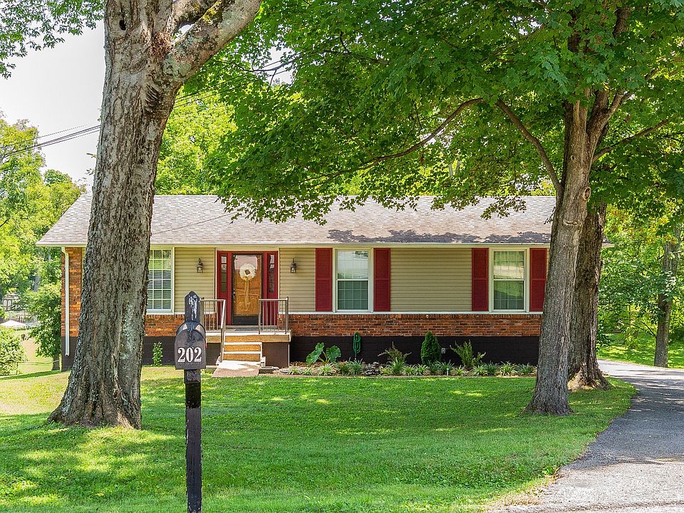 Brick ranch home very clean and sharp looking inside and out. Landscaped, newer paint, new carpet downstairs, other features that have been updated. 3 bedrooms, 1 and a half bath, large rec room downstairs with a wood stove. Hardwood floors upstairs and tile baths. Separate dining room and living room, appliances stay in the kitchen .Dead end street with treed in yard Garage in basement/ call about buy down rate, much lower interest rate from a lender