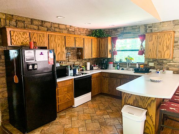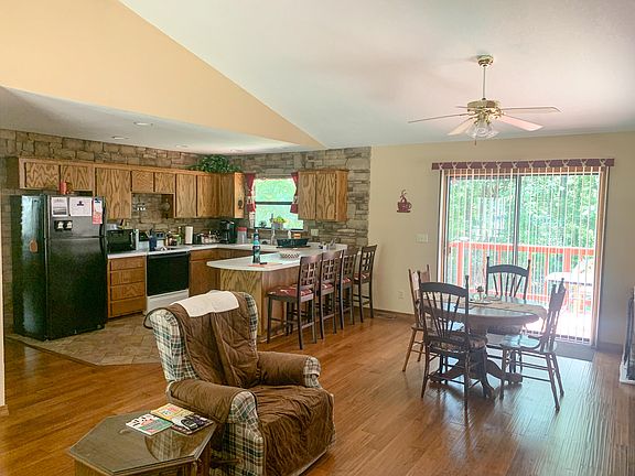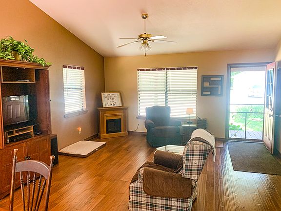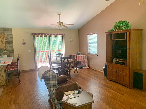 Situated in a quiet neighborhood in the Village of Theodosia, this 2 bedroom, 1 bath, 1038 square foot home is only a five-minute drive from Bull Shoals Lake in one direction, and the town's amenities in the other. The home, on city water and sewer, sits on 7 village lots, about 1/3 cleared and 2/3 wooded, providing a mostly level yard and wooded surroundings.The home's open floor plan includes a country kitchen with a breakfast bar. The dining and living areas' vaulted ceiling convey a sense of space while an electric fireplace imparts warmth and ambiance. There's central air and heat with a whole house dehumidifier, and a very classy bathroom with shower and a jetted tub. A large covered front porch and a back deck will afford you a place to kick back and enjoy the surroundings. You can park in the 2-car carport and stash your belongings in the 12' x 16' storage shed. A chain link fence in the back yard will hold Fido at bay while you roast hot dogs or make s'mores around the firepit. This place delivers the feeling of country village life at its best. Spend your off-time here, on the lake or puttering in the garden, or move in full time and simplify your life. Very neat and well kept! You better hurry!