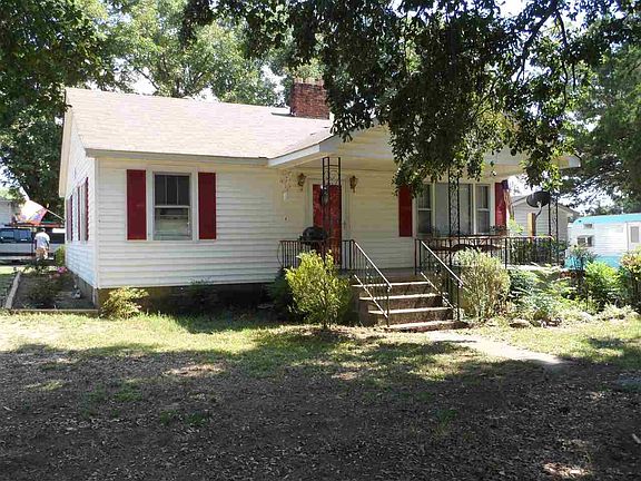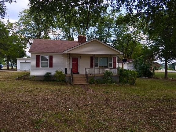 NEW PRICE on this cute one owner bungalow style home right in the center of town. Nestled under huge oaks and surrounded by fruit trees, this home features a huge living room with a fireplace and gas logs, a formal dining room, a kitchen/breakfast combination, a separate den with wood burning stove, two spacious bedrooms, one bath and a laundry room. Hardwoods throughout main living areas and bedrooms. Outside living space includes a rocking chair front porch, a huge patio, paved drive with extra parking and a potting shed. BONUS!! A detached garage and workshop is great for boat or tractor storage or cars. This home is being sold "As Is". Use your imagination for your personal home, a business or good investment property.