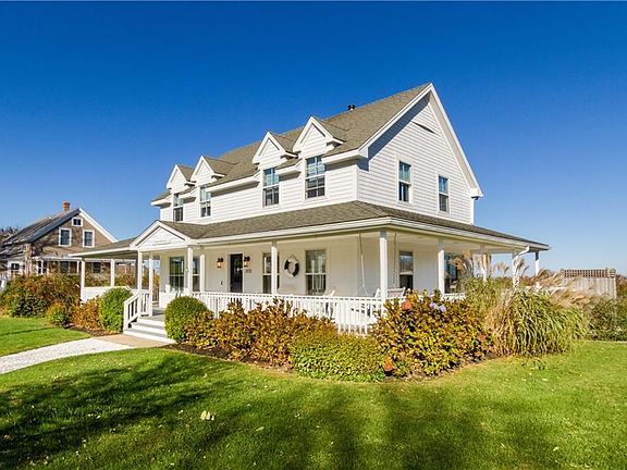 Charming Luxury. Be near it all with Round the Bend. Located just outside of Town this beautifully appointed home offers views of Town and the Atlantic Ocean. Just a short distance up High Street, Round the Bend is the ideal in-Town location. It is all right at your doorstep, beach, Town, shops, dinner, ice cream, movies and more. Walk into Round the Bend and feel at home. Open and all on one level is the dining, kitchen and living, beautifully decorated with a place for all to enjoy. Live the luxury inside and outside in this home with a full wrap around porch and screened in dining area. Entertain and adore the views of Town and the ocean in this in an Island screened in porch! Second floor offers 4 bedrooms, each with its own unique decor and comfort. Enjoy the master suite with en-suite bath and views of the ocean and Town. There are three more bedrooms on this level, one with two sets of bunks, a front room "with all of the views" offers a single set of bunk beds, and the remaining room has a queen bed. Each room is spacious and has thoughtful, luxurious touches. Just off the living area is the entrance to the full finished lower level. This is the room for all to play! Fun and kid-friendly this level has a large sectional couch, TV, ping pong and a full bath. Large yard, outside shower and plenty of outside furniture, including two swinging benches, make this home a place to relax, play and enjoy all that Block Island has to offer.