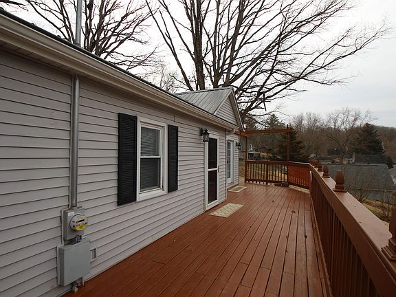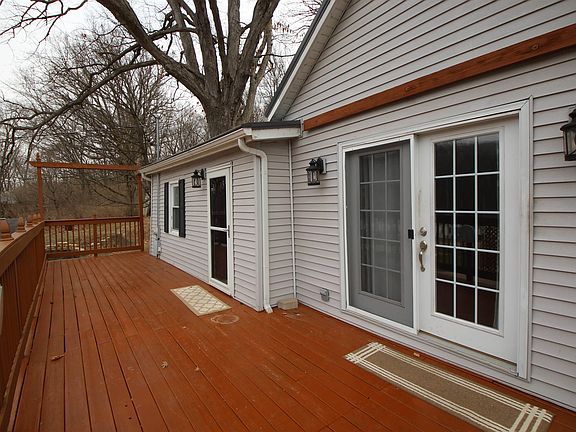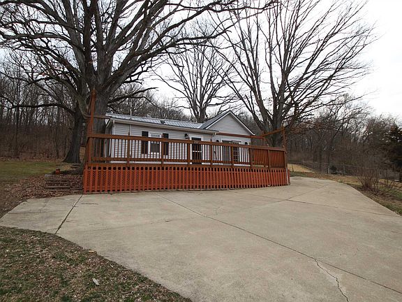 Rare find! Unique 2 bedroom ranch situated on nearly a one acre wooded lot with mature oak trees. Large 40’ front deck is great for entertaining or relaxing. Spacious living room with newer laminate flooring. Beautifully remodeled eat-in kitchen includes cabinets, countertops, metal backsplash, sink and stainless steel appliances. French doors off kitchen to deck as well. Convenient main floor laundry off the kitchen with washer & dryer included. Updated and oversized bathroom. Both bedrooms feature double closets and newer laminate flooring. Primary bedroom has slider to 18’9” x 12’ patio. Versatile den has access to basement storage. Owner loved for over 50 years! New metal roof with lifetime warranty 2019. Vinyl siding and windows approx. 10 years old. HE Goodman 2 stage furnace and central air 2011. Water heater approx. 2018. Newer interior doors, framed wall mirrors, mini-blinds, pex plumbing and more. No worries about all the leaves with Gutter Helmets! Terraced backyard with numerous tulips. Oversized concrete driveway (also provides off street parking) approx. 9-10 years old. Home sold as is.