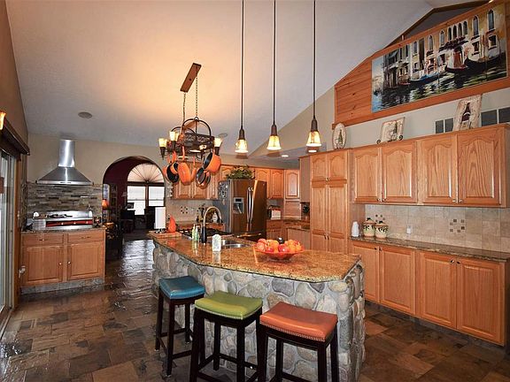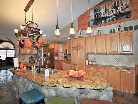 • INTERIOR FEATURES: Eat-In Kitchen, Window Coverings, Hardwood Floors, Vaulted Ceiling, 1st Floor Laundry, Ceramic Floor, Pantry, Great Room, Loft, Master Bath, Foyer Entrance, Walk In Closets, Large Closet, Workshop, Island Kitchen, Solid Surface Countertops, Custom Wiring, Wet Bar