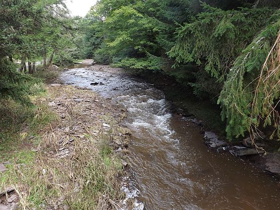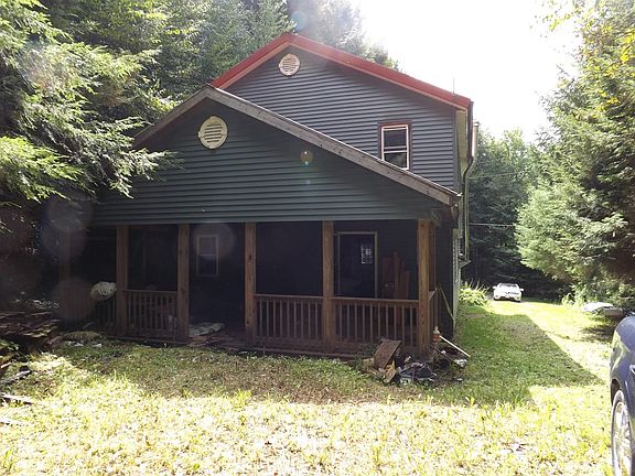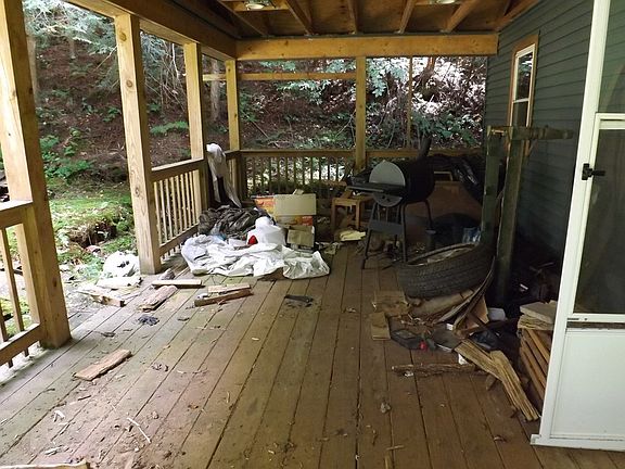 Has potential if you're willing to do some work - 3 bedroom home/cabin overlooking the creek, vinyl siding, metal roof, newer covered porch, replacement windows. Needs to be cleaned out and cleaned up. 5+ wooded acres and small shed, $65,000