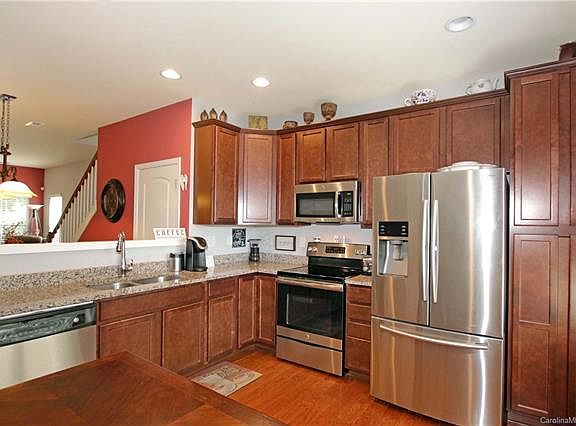 DON'T MISS out on this rare find. Beautiful end unit townhome with garage and 2 master suites located in TOP RATED Mooresville Graded School District!! This newer 3 bed/3 bath townhome is loaded with upgraded features! Kitchen features include 42" cabinets, granite countertops and SS appliances. The open floorplan has wood floors throughout the main living area, and the livingroom has a gas fireplace. The 2nd master (located on the main floor) features a walk-in shower for accessibility. Upstairs you will find the master suite with vaulted ceiling and additional bedroom and full bath. The loft has tons of natural light and provides a second entertainment space or place to relax. Enjoy morning and evenings on your covered front porch or private back patio overlooking a natural wooded area. This MOVE IN READY home features so many hard to find features at a great price and convenient location.