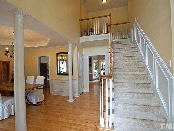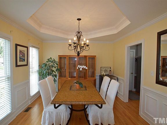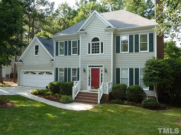 CUL-DE-SAC! CUSTOM home on .22 acres wooded lot w/mature trees! Well maintained home in a Fabulous community w/great schools - Close to everything - Airport, RTP, Hwy 55, I-540, SouthPoint Mall, Restuarants, Starbucks & MORE. 3 BDRM + bonus RM + SUNRM + FAMILY rm w/gas log fireplace. Kitchen w/CENTER ISLAND, granite counters, SS appliances. New interior paint. Master retreat w/Spa bath jetted tub. 3rd flr Unfinished Walk-Up attic f/addtl storage. Over sized deck overlooking large private yard.