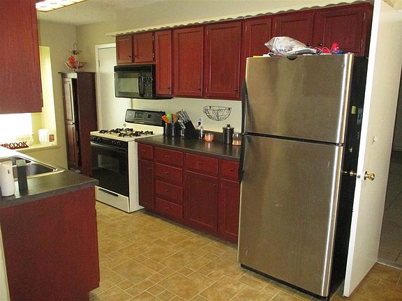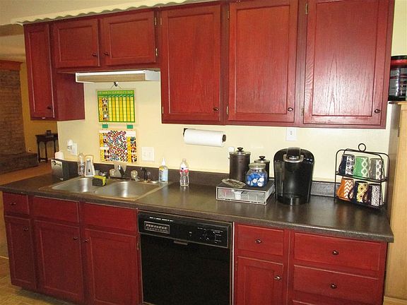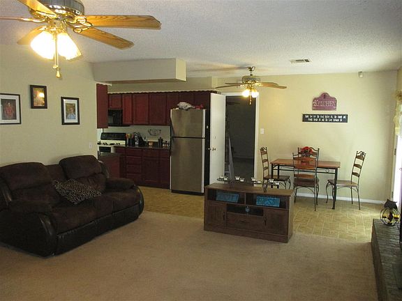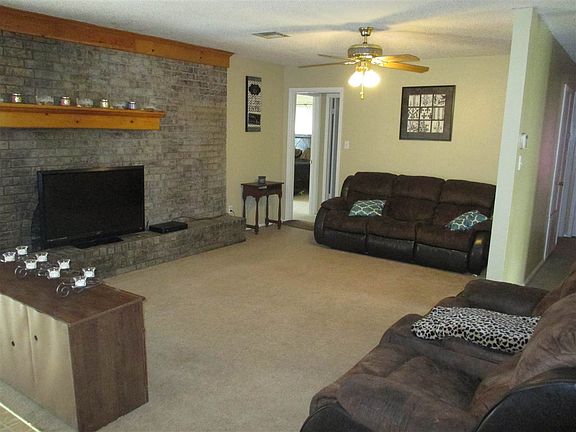 Home has an open floor plan with 3 bedrooms and 2 baths. Fireplace in the living area/dining. Kitchen cabinets have been recently stained and the counter tops have been refinished, all kitchen appliances remain. Large laundry room with pantry area. Two storage buildings and a carport for plenty of room. A chain link fenced in yard provides lots of room for the kids to play. The converted garage adds that extra living area and has tile floor for easy clean up.