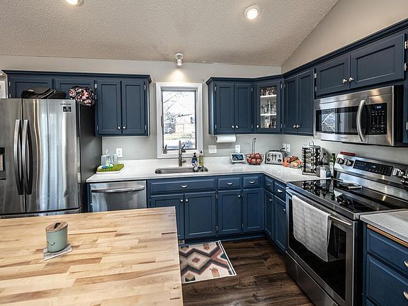 Welcome to this stunning split-entry home nestled on a spacious corner lot. The kitchen features a large center island and corner pantry. Appliances new in 2021 along with quartz countertops. The main level features vaulted ceilings, giving the living area a bright and open feel. Lower level flooring was new in 2021, features a cozy gas fireplace and two bedrooms. This home also features a spacious three car garage, plenty of room for vehicles, outdoor equipment or even a workshop. Water heater was replaced in 2021, HVAC system new in August 2023.