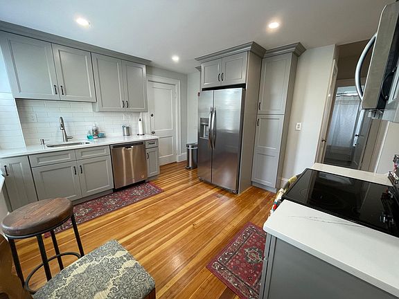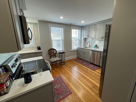 Large and recently renovated 4-bed/2-bath Watertown apartment for rent over two floors (2nd and 3rd floors) with views of Oakley Country Club. Living and dining rooms with hardwood floors throughout. Modern kitchen with quartz countertops, stainless steel appliances, dishwasher, gas stove, microwave, and fridge with ice maker. Four nicely sized bedrooms and two fulls baths including primary bathroom with double skylights. Bonus sunroom plus small porch with beautiful views of Oakley Country Club. Central AC. Washer/dryer in-unit. Off-street parking for 3 cars. No pets please. Available 1/1 or 2/1. First, security and brokers.