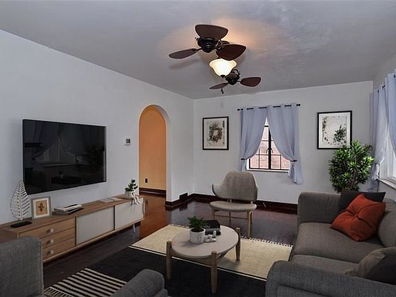 Welcome to your personal retreat! You'll feel relaxed as soon as you step onto the covered front porch- great for unwinding rain or shine. The arched front door is the first of many charming details you'll find in the sunny living room anchored by a brick fireplace. The refinished hardwood floors run throughout the living & dining spaces. Open floor plan leads right into the kitchen. New tile floor, updated stainless steel appliances, and cabinet space to spare! Step out to the fenced, level back yard. So easy to maintain! It's perfect for pets, play, grilling, gardening- name it! Imagine yourself enjoying morning coffee. Extra storage in the shed & more off-street parking behind the fence. Upstairs you'll find the spacious master bedroom- a great escape from the day, with huge closet. Second bedroom and full bath round out the second level. Attic and freshly painted basement provide storage galore! The updated mechanicals will allow for peace of mind as you enjoy your new home.