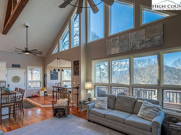 Gorgeous VIEWS from this contemporary light-filled Misty Mountain Home. Open floor plan with stunning cathedral ceilings and a wall of windows to enjoy the view. The main floor, primary suite has a large walk-in shower in the spacious bath. The main living area features gorgeous cherry floors, a gas fireplace, and an elevated dining area. The loft has an incredible view and an en-suite bathroom. Downstairs is a den/game room with two more bedrooms, laundry, a deck with views, and a wonderful bath with a clawfoot soaking tub. Fully furnished with exceptions. This is hard to find in Blowing Rock! Subject to NC Vacation Rental Act.