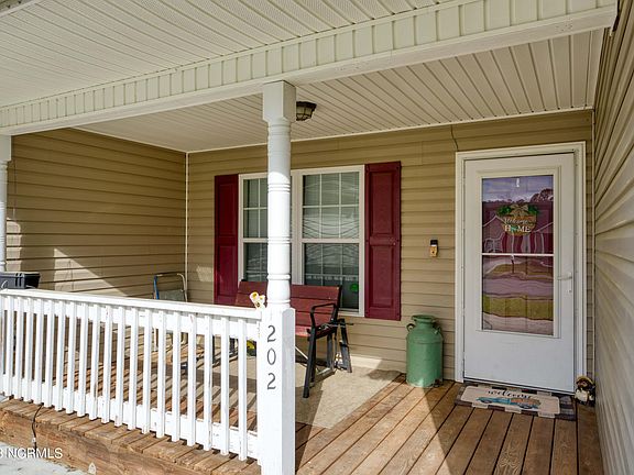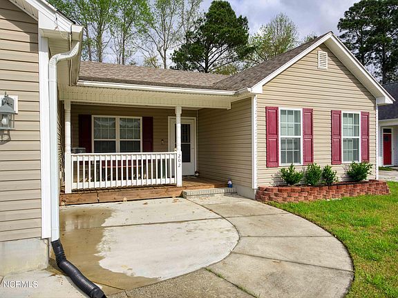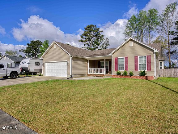 Four bedroom home with an open floor plan just minutes away from Camp Lejeune. A spacious kitchen with stainless steel appliances, granite countertops, backsplash subway tile, and an island. The living room is roomy with vaulted ceilings and a gas fireplace. The master has a walk-in closet, vaulted ceilings and double sink vanity. No carpet in the home, LVP and tile!! Outside you will find a covered back porch that opens up to a large deck shaded with a nice tarp. Fenced in back yard with a storage shed. The front of the home is nicely landscaped with an extra parking pad and a covered front porch. This home will check all your boxes!! Schedule your appointment today!!