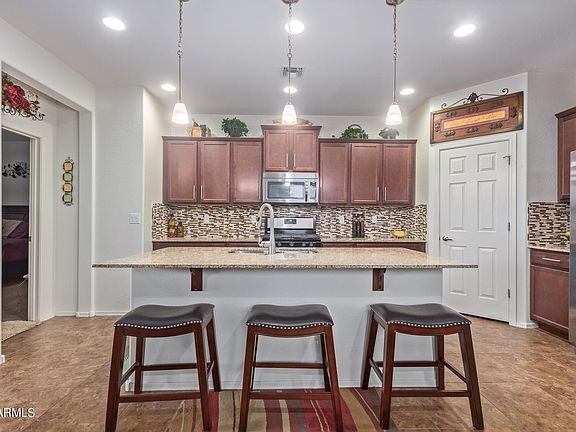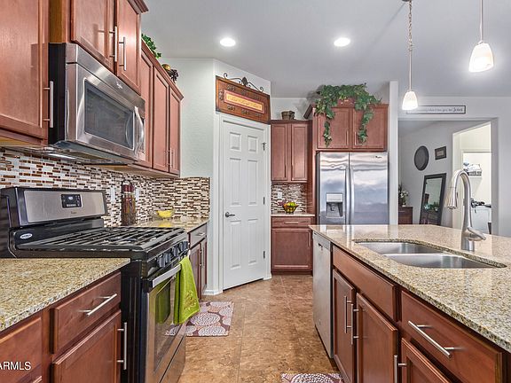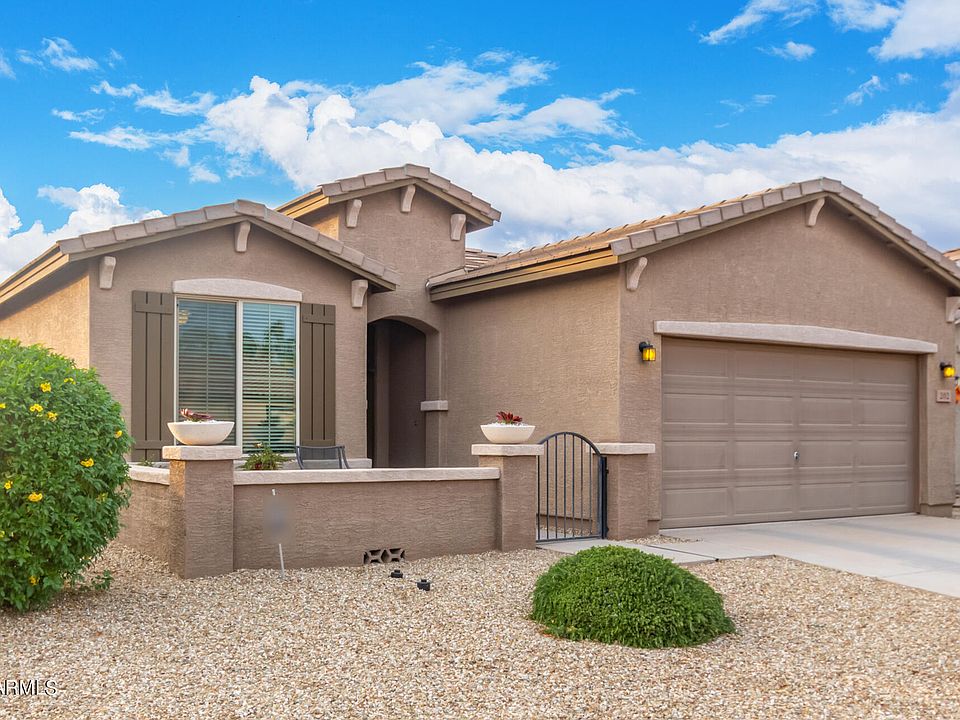 Be the proud owner of this 4-bed, 2-bath home! Sweet curb appeal & spacious courtyard w/welcoming iron gate are just the beginning. Inside, the great room boasting living & dining areas plus a wide-open kitchen is perfect for entertaining. Cook delicious desserts in the gorgeous kitchen equipped with SS appliances, an island w/breakfast bar, a mosaic backsplash, a pantry, and beautiful cabinets. Adorable main bedroom has a walk-in closet and a private bathroom with dual sinks for added comfort. Low-care backyard offers a covered patio, an artificial turf area, a lovely fountain, and two paved seating areas. Don't wait! This gem surely sells fast!