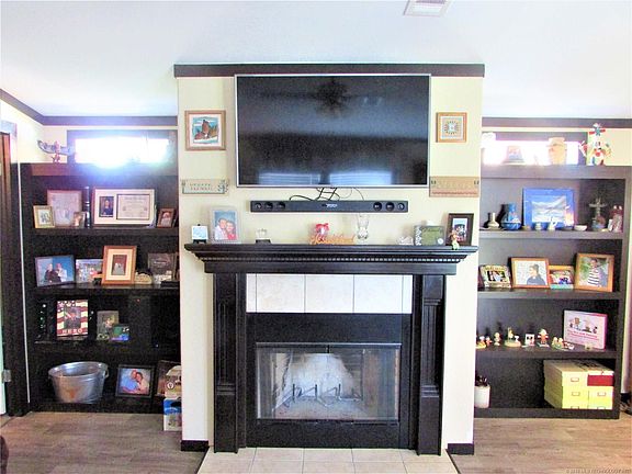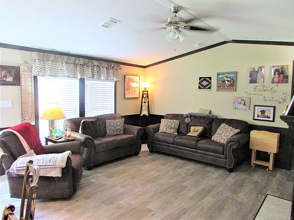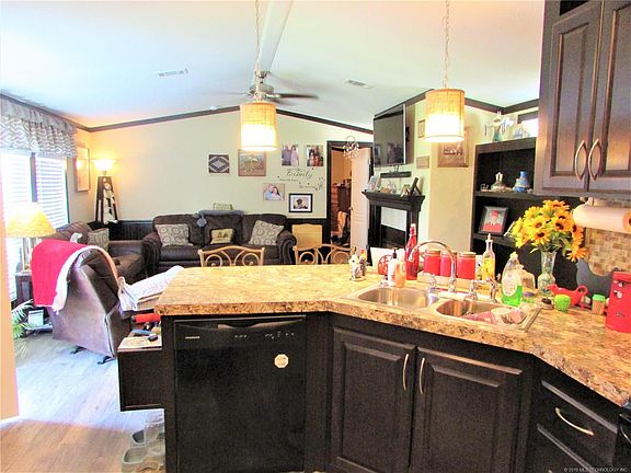 Beautiful manufactured home on 2 corner lots with mature trees. Detached garage with window unit, floating island, coffee bar, barn door for pantry, open floor plan, split bedroom design, soaking tub and shower in master bath, built in bookcases, fireplace and kitchen bar with stools. 2 blocks from school. A must see pristine home.
