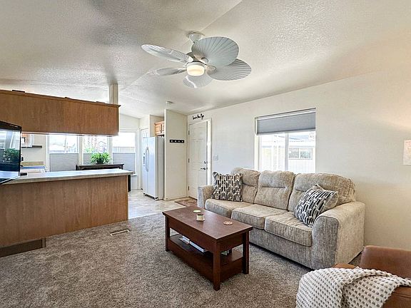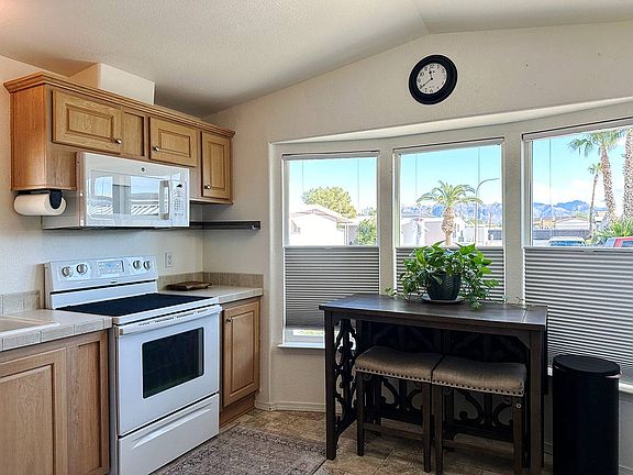 Magnificent Superstition Mountain views from this immaculate all-electric 2008 Skyline manufactured home located in a family-owned 55+ community in Apache Junction. Great perimeter location with bonus outdoor space, this LOVELY, well-cared-for home offers a well-designed floor plan with approximately 728 SQ' featuring (2) bedrooms and (1) bath, center living room and front eat-in kitchen with large bay PICTURE-WINDOWS facing east with an unobstructed mountain view. Home has recently been updated with NEW deluxe plush carpet, NEW Interior paint, NEW top-down and bottom-up cloth blinds throughout and a new kitchen sink with sprayer faucet in 2021. Other updates include newly installed name brand stainless-steel dishwasher (2024), over-counter microwave (2021), 30" smooth-top range (2018) and has a side-by-side refrigerator (older but works fine and has filtered water and ice). Other popular features include TAPE & TEXTURED INTERIOR WALLS, custom windowsills, SHINGLED ROOF, package unit central ac & heat, DUAL PANE WINDOWS, ceiling fan(s) with remotes, sturdy hardboard siding plus carpeted and railed steps (including large front up-and-over at south-side entry). Generous storage throughout including KIT pantry, built-in hall storage cabinet, overhead laundry area cabinets and (3) door built-in linen cabinet in bathroom. Bathroom offers a full-size WALK-IN SHOWER with double seats, extended vanity, comfort height commode and frosted glass window. Primary bedroom offers a large sliding wardrobe closet and rear window and PEACEFUL VIEW OF MATURE GREENERY. Plenty of room for double in-line parking with an approximate 13' X 54' concrete driveway and HIGH-PROFILE CARPORT(accommodates a full-size truck). Large 8' X 12' storage shed is perfect for hobbies with electric, shelving and pegboard and a smaller 4' X 6' rear half-shed provides for storing incidentals. Per community management base lot rent is $631 per/mo. + 22.84 (curbside garbage pick-up), $25 sewer charge (community septic system) and last month's water bill was $44.16. This home is listed with a pre-owned mobile and manufactured home broker/dealer licensed by the Arizona Department of Housing and is not a real estate brokerage. Sale contingent upon residency approval by community management which includes a credit/background check and requires proof of income. Pets okay, some restrictions apply. Close to shopping, banking, restaurants and more. Possession negotiable between buyer and seller. This one has the WOW factor!