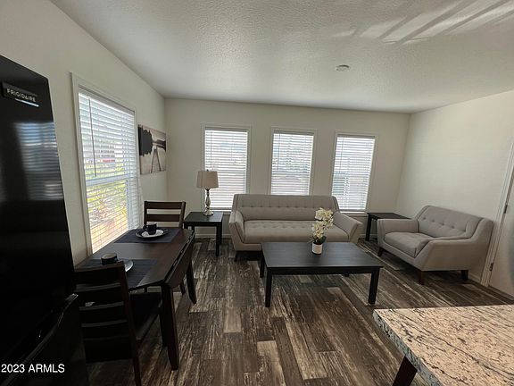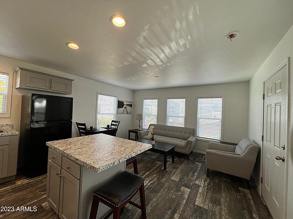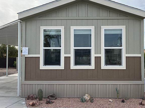 BRAND NEW.. 2022 Clayton Manufactured Home just arrived before the winter season, this beautiful home has a huge quite corner lot, this 16x44 is a 2 bedroom, 1 bath, includes a 30 year shingle roof, painted hard board siding, vented vinyl skirting, comes with a central AC/Heat package unit, large driveway with new hassle free aluminum carport awning, front water saving desert landscape package and a large 8x8 storage shed. Lease rent $593.