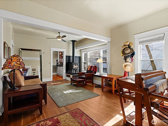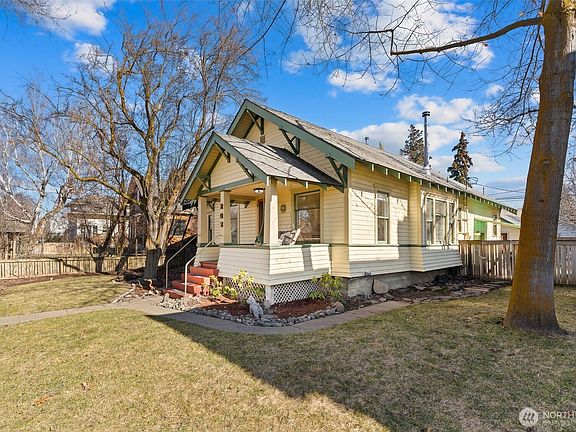 Nestled just blocks from Ellensburg's historic downtown, this beautifully updated 3-bedroom, 2-bath Craftsman blends classic charm with modern comforts. Enjoy the convenience of being near local restaurants, tasting rooms, and Safeway while relishing the tranquility of a tree-lined street.Inside, this home exudes warmth with original character details, wood floors, and abundant natural light. The primary suite is a private retreat, featuring vaulted ceilings, French doors leading to the backyard, a spa-like en-suite with a tiled walk-in shower, dual vanities, and a generous walk-in closet. The cozy living area includes a charming wood stove and a built-in window bench, ideal for relaxing.