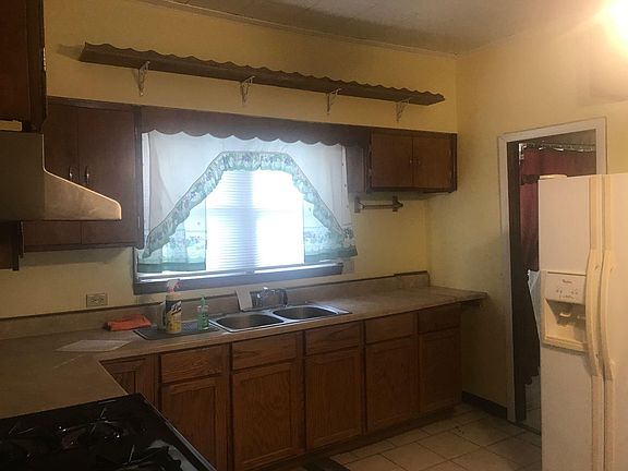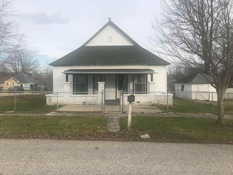 Home with large corner double lot with partially fenced yard. New siding in October 2020, spacious rooms, additional room could be used as a 2nd bedroom. Stove and refrigerator stay, main level laundry and covered front porch.