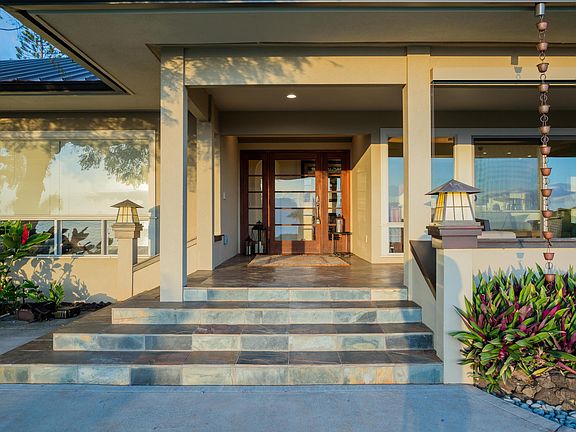 Poised gracefully along the contours of a tranquil unobstructed overlook, this estate is ensconced in utter privacy. The exquisitely designed wraparound porch, adorned with opulent ipe hardwood accents, is perfectly situated for savoring the captivating spectacle of winter whale watching and, need we mention, year-round sunsets that will leave you breathless! Cool, sophisticated slate flooring flows seamlessly from the lanai throughout the entire expanse of this residence, crafting an uninterrupted blend of indoor and outdoor living spaces that spans over 3000 square feet under the protective embrace of the roof. The kitchen, a recently transformed culinary oasis, is a testament to luxury living. Outfitted with top-tier Bosch appliances, a sumptuous propane cooktop, and resplendent Taj Mahal quartzite countertops, it effortlessly extends to the rear dining patio and the chef's own garden area with lots of potential. This property is thoughtfully equipped with an owned grid-tied photovoltaic system, ensuring a sustainable supply of electricity, complemented by a Tesla backup battery system. Additionally, a discreet electric car charger stands ready to serve your eco-conscious transportation needs. The inclusion of Nest outdoor security cameras, and Doorbird Entry System at the gate, further elevates this residence into the realm of modern sophistication. For the connoisseur of fine automobiles, the expansive two-car garage exceeds expectations, offering ample storage. In a brilliant touch of versatility, there's also a generously proportioned 560-square-foot agricultural storage room/nohana, complete with a separate entrance and a fully permitted bathroom. This is your opportunity to claim ownership of CPR unit B, nestled upon a .604-acre parcel, within the encompassing embrace of Mahanalua Nui subdivision of Lauiniupoko. Discover a lifestyle where luxury meets nature, where craftsmanship meets contemporary elegance, and where every day brings a symphony of ocean vistas and sunsets that paint the sky in hues of sheer magnificence.