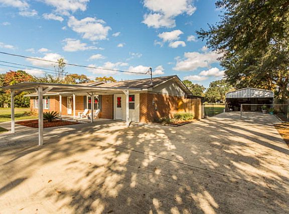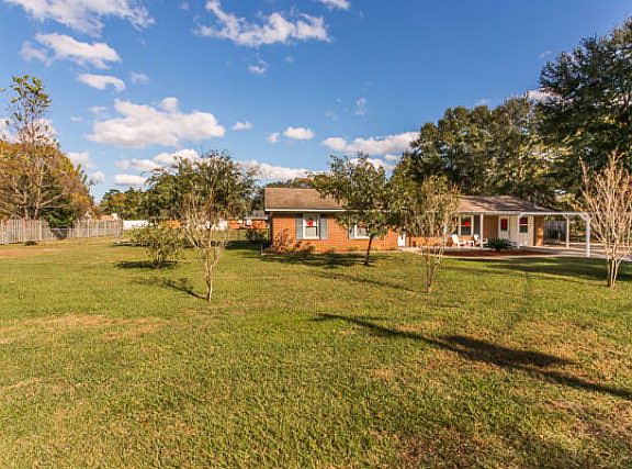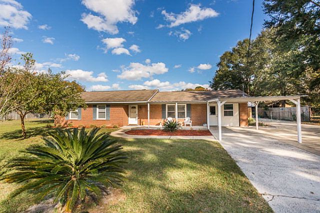 Extremely well kept, one-level brick ranch home in conveniently located, established neighborhood. Deceivingly spacious once inside! Living room has a wall of built-in bookshelves/cabinetry and fully equipped kitchen is open to dining area. There's a huge family room w/HW laminate flooring, vaulted ceiling, wood burning FP & sliding glass doors opening to a spacious (16x16) screened rear porch. Three bedrooms, two full updated baths & Bonus room that can be study, workout space, playroom or craft/sewing room. All windows have been updated with energy efficient ones, central HVAC 3 yrs. old & roof reshingled approx. 5 yrs. ago. Spacious fully fenced rear yard, irrigation well and detached 20x30 outbldg. that can be an RV port, workshop or extra carport. Bonus--NO FLOOD INSURANCE REQUIRED.