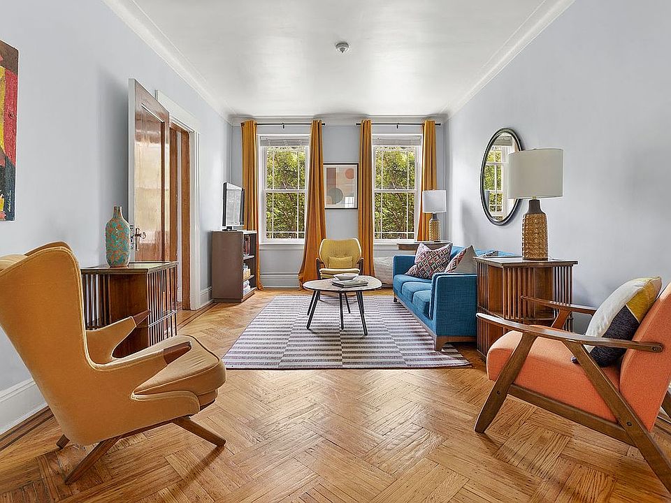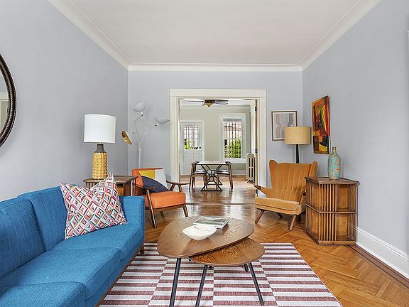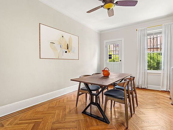 The sun-drenched parlor level makes a statement with its living and dining rooms. The living room is spacious and looks out onto Prospect Park. There are French doors into the formal dining room with views into the verdant backyard. The cove ceilings and parquet floors are lovely details.