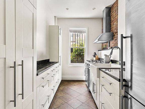 The house, a legal two-family being used as a one family, is 18’ wide with 4 bedrooms and 2.5 full baths, plus a fully finished English basement with coffered ceilings, exposed brick and a private entrance. This refined home has great light and graceful proportions.
