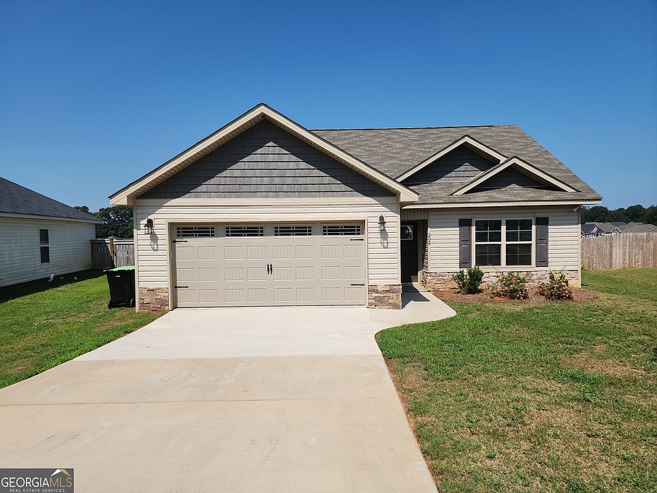 Stylish 4-Bedroom Home with Open Floor Plan This beautiful 4-bedroom, 2-bath home offers an open and inviting layout perfect for modern living. The exterior features low-maintenance vinyl siding accented with stone for stunning curb appeal. Inside, luxury vinyl plank flooring flows throughout all living areas, creating a seamless and elegant look. The spacious kitchen is a chef's dream with a large island, granite countertops, beautiful cabinetry, pantry, stainless steel appliances, and a convenient breakfast bar. The primary suite is a true retreat, boasting two walk-in closets and a luxurious bath with dual vanities. Enjoy outdoor living on the covered back porch, perfect for relaxing or entertaining. This home combines style, comfort, and functionality-ready for you to move in and make it your own!