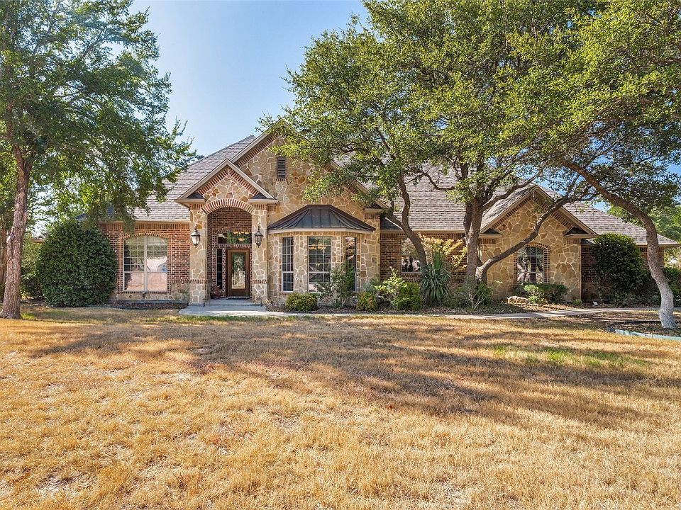 Stunning single story oasis on over 1 Acre in Aledo ISD! Mature landscape welcomes you into the travertine tile entry w 12ft soaring ceilings. Expansive formal dining has tray ceiling & hardwood floors. Grand open concept living has floor to ceiling gas log fireplace & custom entertainment center w surround sound. Entertainers delight eat in kitchen has service bar w seating, sub zero wine fridge, kitchen aid appliances, dual sinks & ovens w desktop workstation. Sunny morning room has butlers pantry overlooking expansive 36x14 covered patio. Formal study has 3x4 safe room. Master ensuite w tray ceiling has bay window, direct access to patio, separate vanities, jacuzzi tub, separate shower & large walk in closet. Secondary beds are large w walk in closets & direct access to full bath. Utility room boasts cabinets, room for freezer & connected 14x9 catering pantry. 3 car garage has built in storage room w AC. Private yard in park like setting is perfect for deer watching. 2023 New Roof!