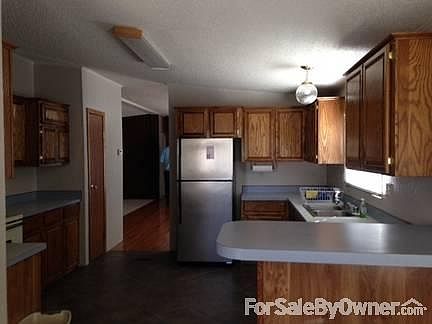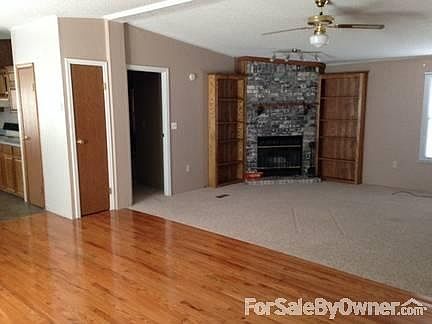 This manufactured home features 3 bedrooms/ 2 bathrooms, large open living/dining room, and large eat-in kitchen. The master bedroom and bath are quite spacious with the bath featuring separate tub and shower. All bedrooms have walk in closets. Kitchen and bath areas have tile floors. Dining room has hardwood floor. Third bedroom/office has built in desk unit. Woodburning fireplace in living room surrounded by built in bookshelves. Dining area has built in hutch. This is a nice home that is well kept up. It was built right and built to last. Home features 2X6 exterior walls and is anchored into concrete footings. Entire property is deeded as one unit. Kitchen appliances that convey with the property include: stove, and stainless steel dishwasher and fridge. OWNER WILL NOT FINANCE.Additional property info: http://www.forsalebyowner.com/listing/3-bed-Single-Family-home-for-sale-by-owner-202-S-Third-St-67835/23925735?provider_id=28079