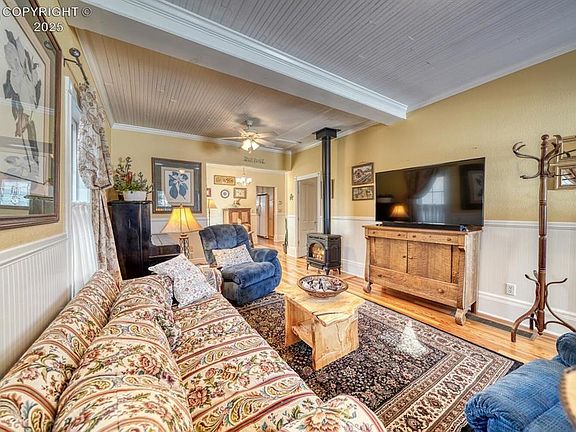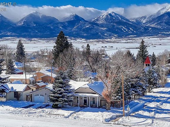 Situated on a spacious corner lot in the heart of Westcliffe, this beautifully renovated home offers comfort, character, and true in-town convenience. Remodeled in 2005 with a well-planned addition, it features three bedrooms (one non-conforming), a spacious office with mountain views, a dedicated library, and two inviting living spaces—providing room for work, reflection, and gathering. Both the living room and family room include thermostat-controlled propane fireplaces, offering warmth and ambience with ease. Large windows throughout frame unobstructed, front-and-center views of the Sangre de Cristo Mountains. Pocket doors, quality cabinetry throughout, and a stucco exterior continue the home’s thoughtful, enduring character. The dining room is positioned to take in the mountain backdrop and provides French-door access to the enclosed courtyard, creating a natural flow for both indoor and outdoor dining. The family room offers sliding-door access to the rear Trex deck, extending the living space and inviting you to enjoy the mountain air. Wood floors and crown molding add a timeless touch, while the kitchen’s warm wood cabinetry creates a welcoming, functional center to the home. Outdoor living is exceptional, with a covered front porch, a private courtyard, and a rear deck—all finished in durable Trex decking. An automatic sprinkler system, mature aspen and evergreen trees complement the fenced yard. The garage offers a workshop area suited for storage or hobbies, and a 10x20 shed provides additional flexible space. Originally formed from two miner cabins later combined and expanded, the home carries a quiet historical thread. A shadowbox table displaying late-1800s artifacts remains with the property. Within walking distance to downtown, this home blends mountain beauty, small-town charm, and a story uniquely its own. Schedule a showing today to experience the history, heart, and mountain presence that make this Westcliffe home truly unforgettable.