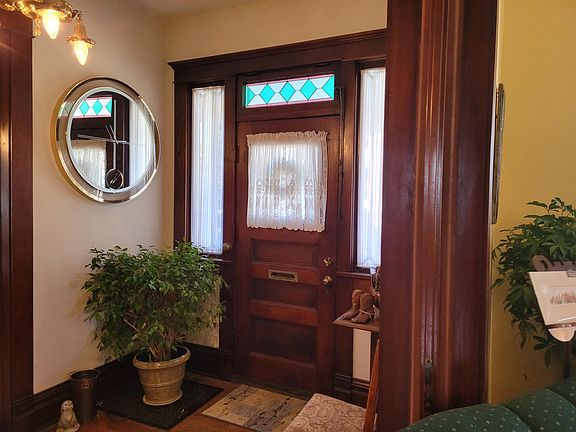 Original natural ornate woodwork, wood floors, beautiful open stairway, transoms above doors that work, several sets of working pocket doors, curved glass diamond pane windows, large wrap around porch, large back yard with many perennials, raised garden beds, and patio. Two car detached garage with openers. This is a fabulous vintage home in excellent condition. Must see!