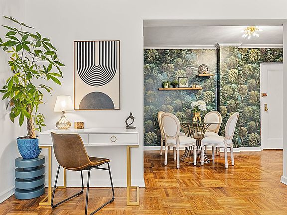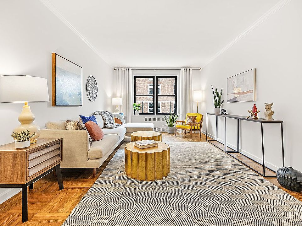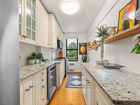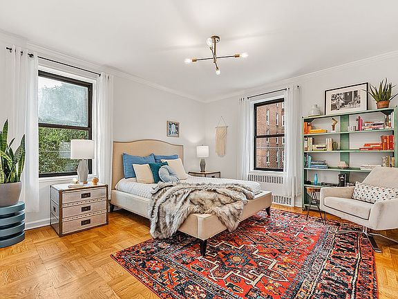 The sun-filled and oversize corner primary bedroom can easily fit a king-size bed and substantial furniture. The second bedroom is also comfortable and accommodating. The renovated windowed bathroom is tasteful, crisp, and clean.