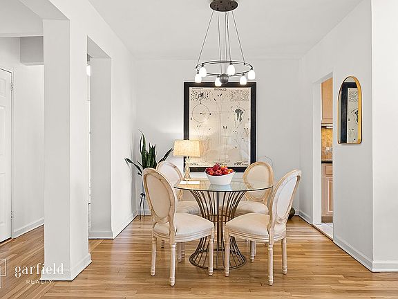 Well-proportioned and inviting, this airy oasis is bathed in natural sunlight, blending timeless appeal with thoughtful updates. Newly refinished parquet floors enhance the considered layout, which offers a comfortable flow. Enter through a spacious foyer that opens to a generous sitting area, large living room, and dining space adjacent to the windowed galley kitchen. The kitchen features wooden cabinetry, stone countertops, stainless steel appliances—including a brand-new dishwasher—and a built-in microwave.