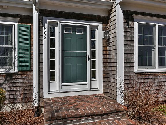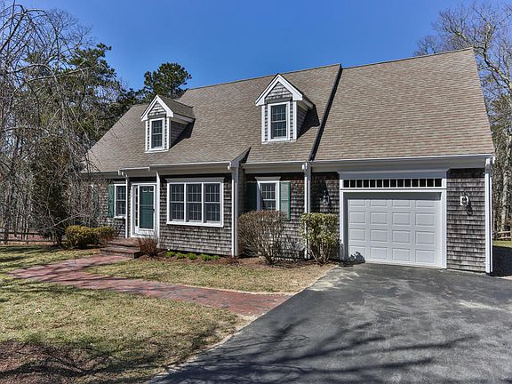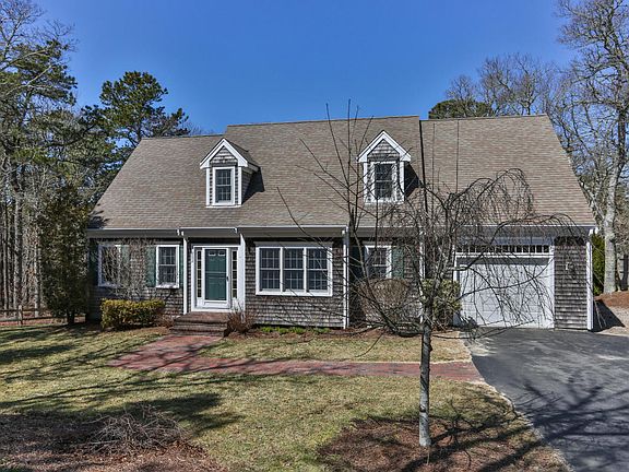 Newer, one-owner, cape-style home features: Landscaped, fenced, irrigated yard on hike-&-bike path. Paved drive with three parking spaces. Brick walk and stairs leading to front entrance foyer with coat closet. First level: Living area with two sliders onto low-maintenance balcony. Eat-in kitchen with center island, front yard view, and garage access. Bed-&-bath suite with third slider onto balcony, windowed walk-in closet, tiled step-in shower (four-level and handheld shower heads, grab bars), and double vanity. Convenient laundry area and half-bath. Hardwood and tiled floors throughout. Second level: Berber-carpeted and tiled floors. Large living/office area with walk-in closet. Second full bath with shower/tub. Spacious second bedroom. Storage above garage. . Basement lightened by four double-hung windows and slider opening onto backyard patio. Amenities include: forced-air gas heat, central air conditioning/humidifier, vacuum and security systems, tilt-in windows. Linen closets in all three baths. Location advantages: Highlands neighborhood (no flood-zone worries) of low-tax Dennis, situated between Bay & Sound-side beaches, central to all Cape Cod has to offer, town water, cable. Rear Yard has wooded views and abutters are Dennis Water and Dennis Conservation.
