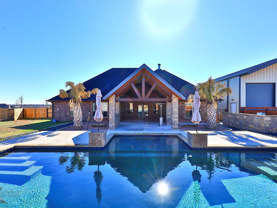 Constructed by Homes By Design, this custom home was the star of the 2017 Parade of Homes. Nestled in the sought-after Southern Cross neighborhood and Wylie ISD School District, this 4-bedroom, 3-bathroom home features a generously sized office and an upstairs media room. The main guest room boasts its own private bathroom, while the other two bedrooms share a well-appointed Jack and Jill bathroom. The master suite offers a tranquil retreat, complete with custom tile work, a standalone tub, and a walk-in shower. This visually appealing home, which is easy to maintain, perfectly juxtaposes the peace of rural living with the convenience of nearby town facilities. The home is designed to leave a lasting impression, thanks to its ample storage and carefully designed living spaces. The stunning backyard, featuring a swimming pool, workshop, palm trees, and a covered patio, adds to the charm of this beautiful property. New roof within the last 6 months