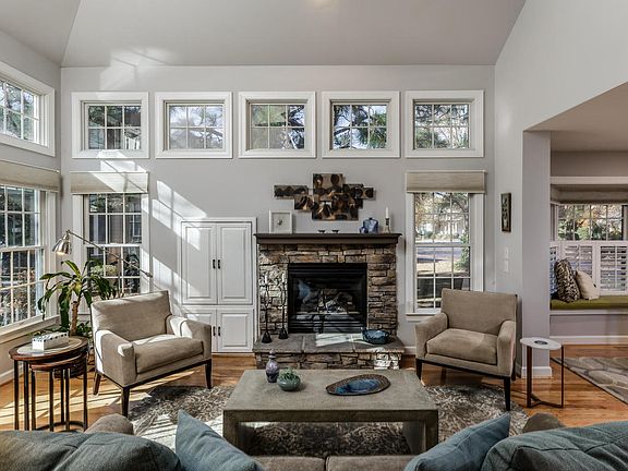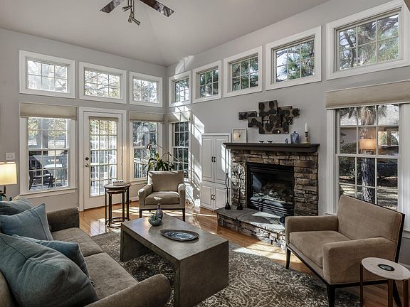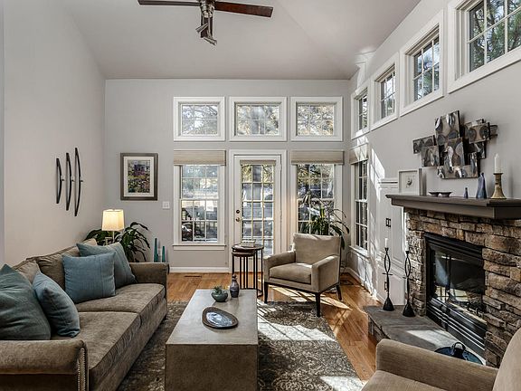 Golf Front End Unit with Stunning Views. Plentiful windows flood home with natural light. Attention to detail with contemporary finished hardwood floors, plantation shutters, window seat in Dining, upgraded light fixtures, custom gas fireplace, and new carpet(2017). Open kitchen includes granite countertop, breakfast nook, pantry, and breakfast bar. Spacious Master Bedroom with vaulted ceiling, 2 closets, and gorgeous views. Renovated (2017) Master Bath dual sinks with granite counter, new tile floor, fixtures and mirrors. Renovated (2017) Laundry with new washer and dryer plus sink & cabinets. Upstairs offers third bedroom, office, bathroom, large storage closet plus separate attic storage. Trex deck overlooking professional landscaping and golf course. Turn-Key Living at its Best!